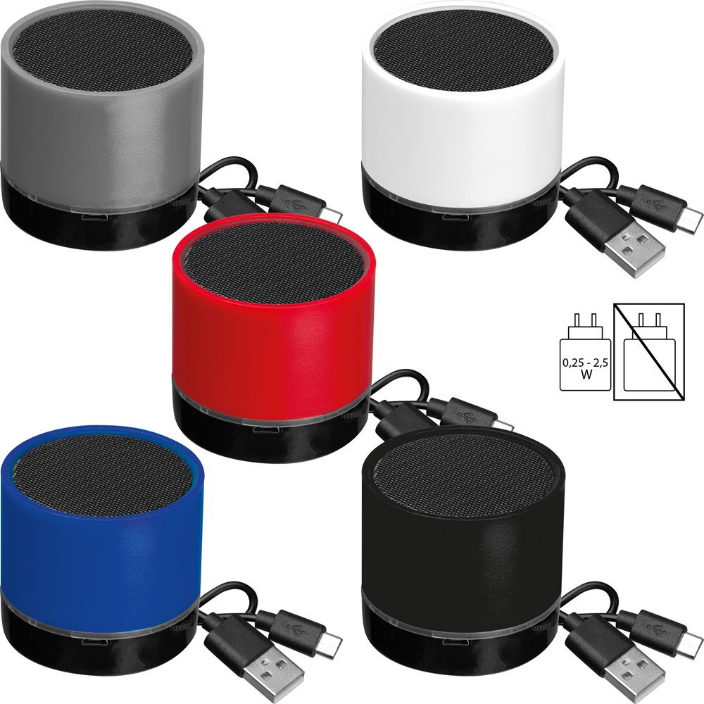 Trendiger Bluetooth Lautsprecher inkl. USB-Ladekabel und einer Akkulaufzeit von 30 - 60 Minuten. Zusätzliche Funktionen: Lichteffekte am oberen und unteren Rand, Micro SD Karten Slot, Micro USB- und USB-Anschluss. Ihre Werbung drucken wir auf das Gehäuse.