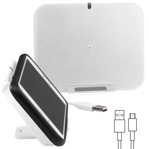 Induktionsladegerät aus Kunststoff inkl. USB-Ladekabel. Laden Sie Ihr Smartphone einfach ohne Kabelverbindung auf. Der Wireless Charger dient gleichzeitig auch als Ständer für Ihr Smartphone. Ihre Werbung drucken wir vorne mittig auf das Induktionsladegerät.