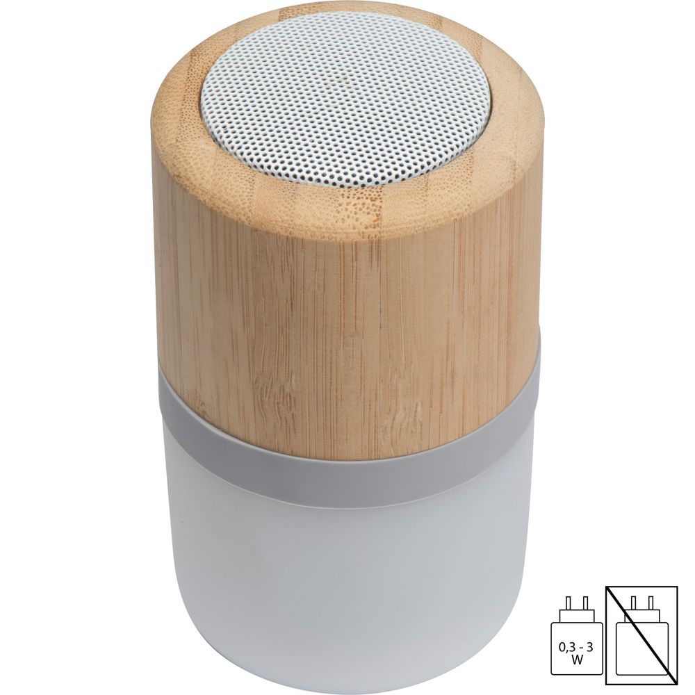 Bluetooth 5.0 Lautsprecher aus ABS und Bambus mit farbwechselndem LED Licht, 300 mAh Akku, Ladezeit 2 Stunden und einer Reichweite von bis zu 10 Metern. Die Werbung wird auf dem Lautsprecher angebracht.