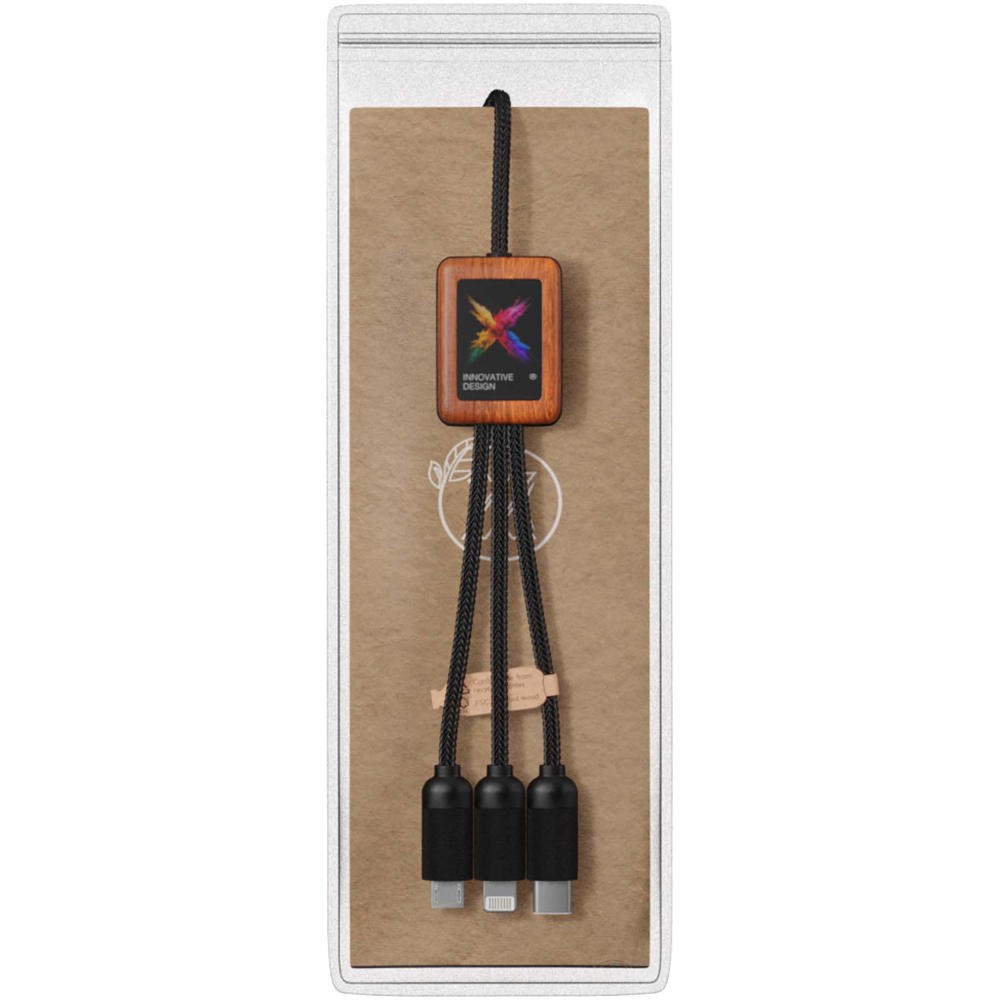 5-in-1 Ladekabel aus rPET mit leuchtendem Logo und quadratischem Bambusgehäuse. Das leuchtende Logo ist auf beiden Seiten sichtbar. Mit 3 Anschlüssen (Typ C, Micro-USB, iPhone) und einem dualen USB-Anschluss für den universellen Einsatz. Geliefert in einem TPU-Beutel, mit einer Karte aus Kraftpapier. Länge des Kabels: 1 Meter. Inklusive 3 Jahre Garantie.