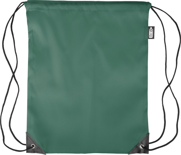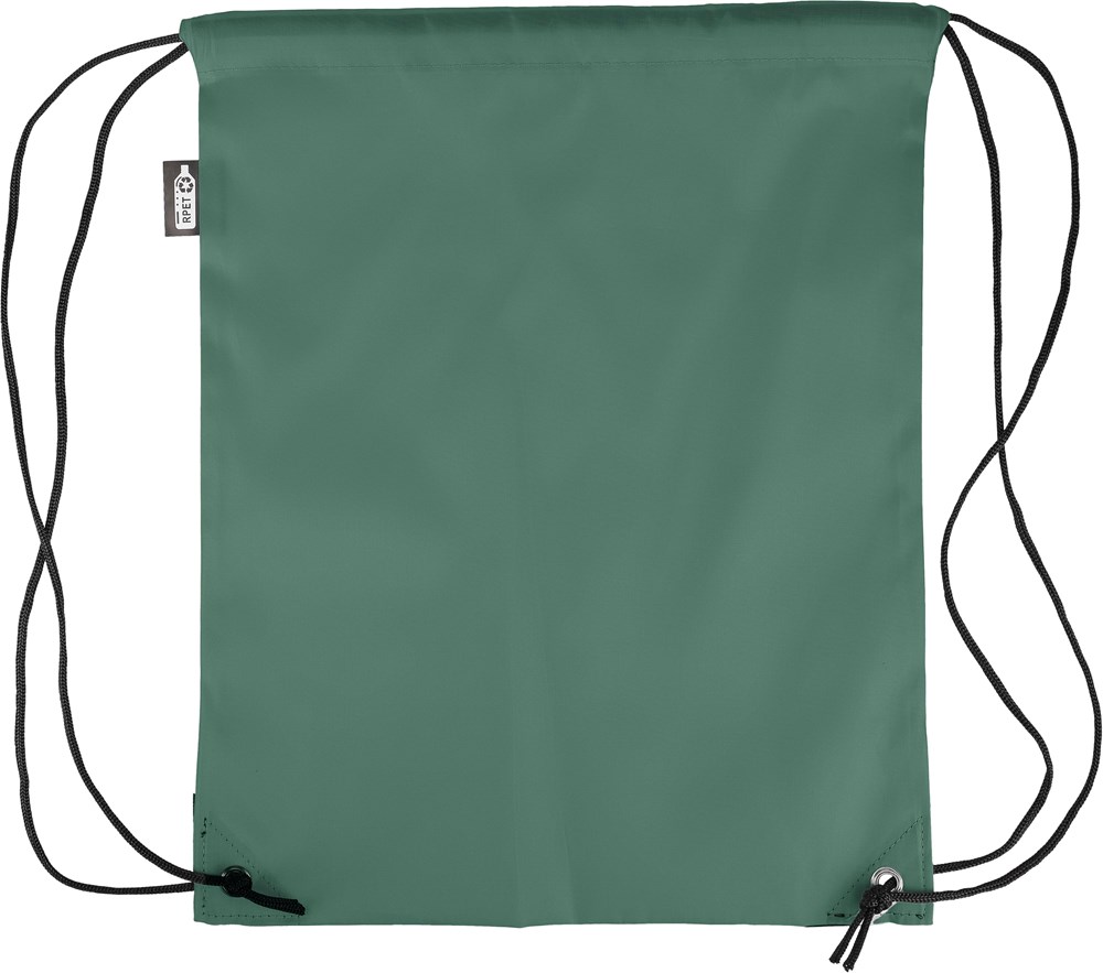 Rucksack aus Polyester 210D mit Kordelzug, zwei schwarzen PU-Ecken auf der Vorderseite und Innennähten. Mit einer schwarzen Nylonkordel an jeder Seite, Kordelzugverschluss. Fassungsvermögen: 5 Liter. Tragkraft: 7 kg. Mit rPET-Etikett.