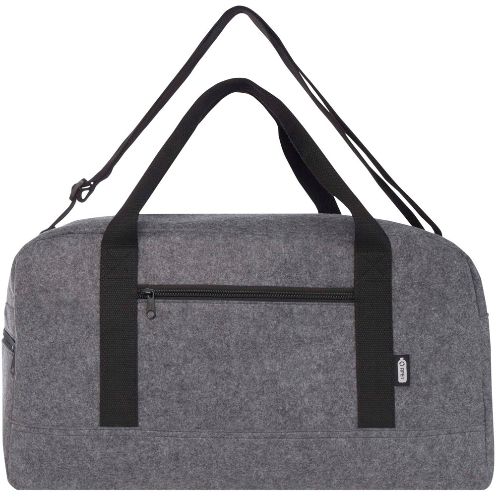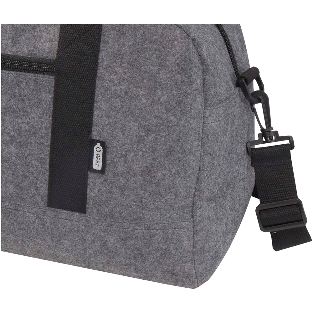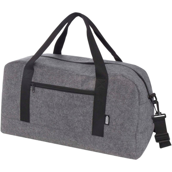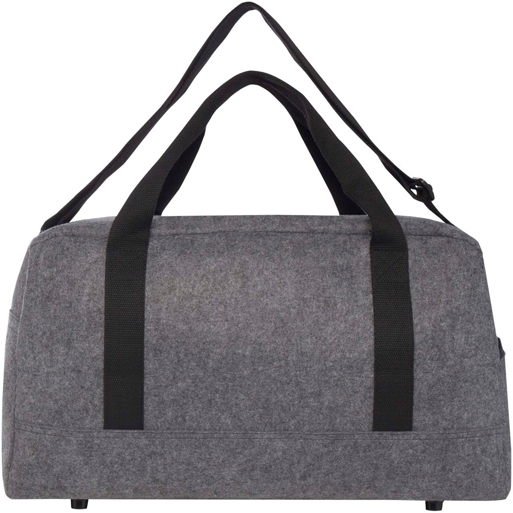 Multifunktionelle Reisetasche aus hochwertigem, weichem und strapazierfähigem Recyclingfilz, GRS-zertifiziert. Sie verfügt über ein großes Hauptfach, eine Reißverschlusstasche auf der Vorderseite, eine Seitentasche, abnehmbare und verstellbare Schultergurte und bequeme Baumwollgriffe für unterschiedliche Trageweisen. An der Unterseite der Tasche befinden sich kleine Füße/Stifte, die die Tasche leicht vom Boden abheben und verhindern, dass Schmutz oder Feuchtigkeit in die Tasche gelangen. Fassungsvermögen: 35 Liter.