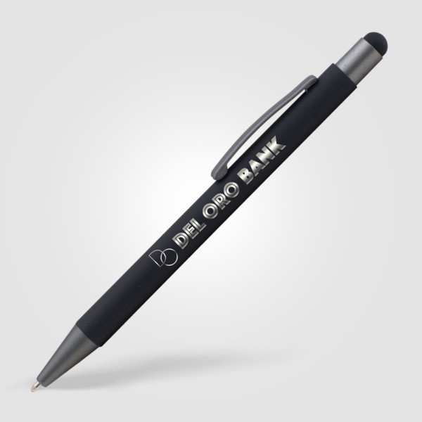 2-in-1-Kugelschreiber mit Soft-Touch-Gehäuse und markanten, anthrazitfarbenen Ausstattungsdetails. Wahlweise mit Spiegelglanzgravur oder Digitaldruck. Der Bowie Stylus ist mit deutscher Tinte für ein besonders reibungsloses Schreiberlebnis ausgestattet. Erhältlich mit schwarzer oder blauer Schreibfarbe.