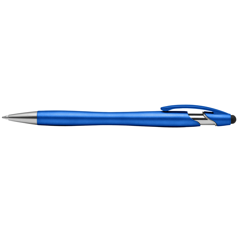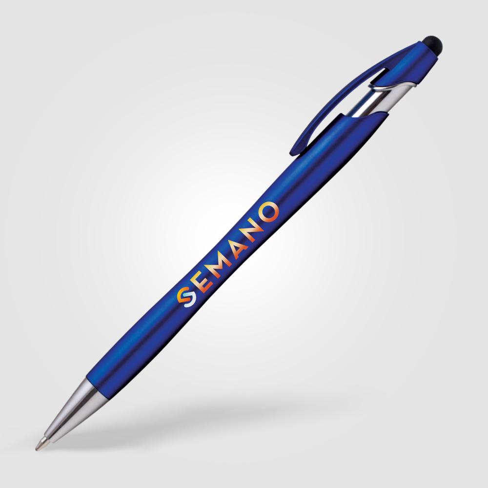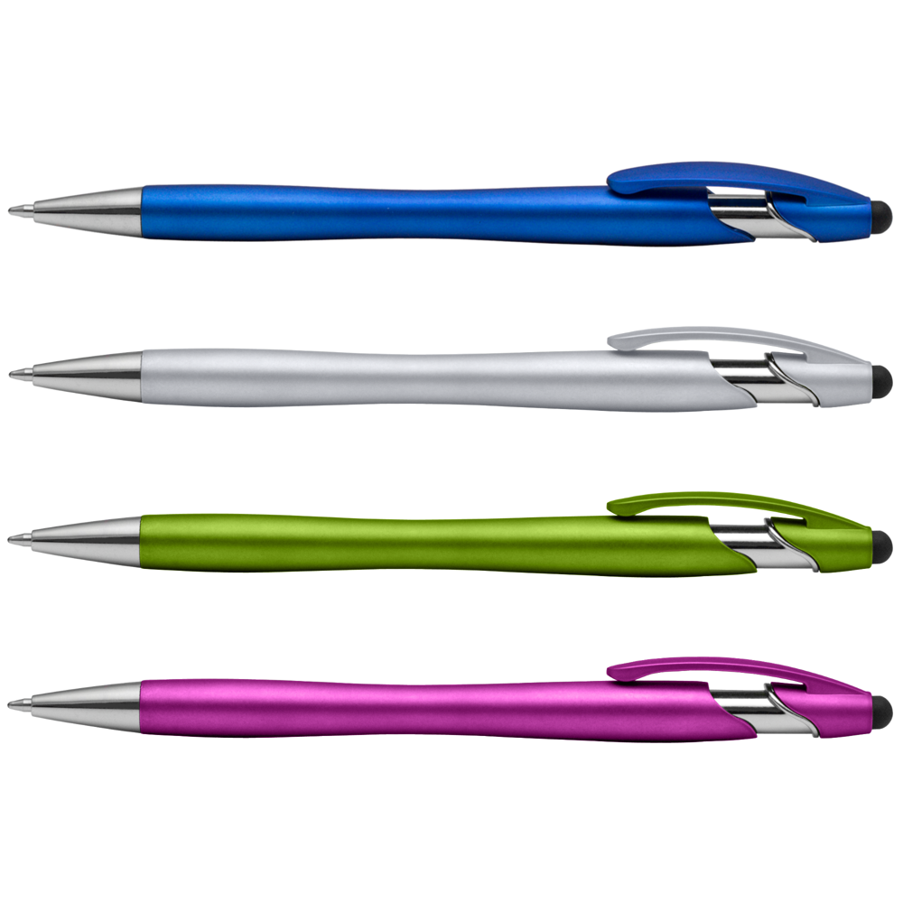 Erregen Sie Aufsehen, wenn Sie dieses Modell an Kunden und potenzielle Kunden verschenken. Dieser metalische Kugelschreiber ist das perfekte 2-in-1-Werbegeschenk. Es verfügt über ein schlankes metallisch wirkendem Gehäuse, einen passenden Clip, polierte Chromakzente und einen professionellen Stylus. Das Beste ist, dass Sie das Modell mit einem vierzeiligen Aufdruck versehen können, der sich gegen die fröhlichen, leuchtenden Metallic-Farben abhebt.