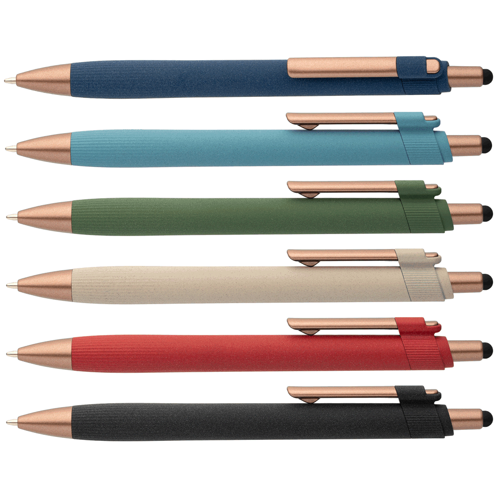 Erleben Sie höchste Eleganz mit dem York Kugelschreiber aus recyceltem Kunststoff, bronzefarbenen Akzenten und Stylus. Der Schaft aus markengeprägtem recyceltem ABS-Kunststoff besticht durch eine edle, steinfarbene Lackierung, die durch elegante, matte bronzefarbene Zierelemente stilvoll ergänzt wird. Navigieren Sie mühelos in der digitalen Welt mit dem integrierten schwarzen Gummi-Stylus, während die schlanke 1,0-mm-Kugelschreibermine mit langlebiger schwarzer Dokumental-Tinte ein bemerkenswert sanftes und gleichmäßiges Schreiben über 600 Meter ermöglicht. Erhältlich in satten, naturinspirierten Farbtönen – Rot, Waldgrün, Salbeigrün, Marineblau, Stone, und Schwarz – vereint der York Kugelschreiber gekonnt Eleganz mit Nachhaltigkeit und ist damit die perfekte Wahl für gehobenes Branding, das wirklich inspiriert.