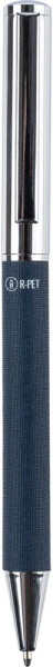 Drehkugelschreiber aus Messing und rPET mit Metallclip und Griffstück. Mit Drehmechanismus und rPET-Logo auf dem Gehäuse. Einzeln verpackt in einer braunen Pappschachtel. Blaue Tinte.