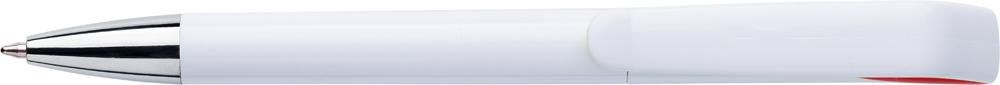 Drehkugelschreiber aus Kunststoff, mit farbigen Akzenten und blauer Mine.