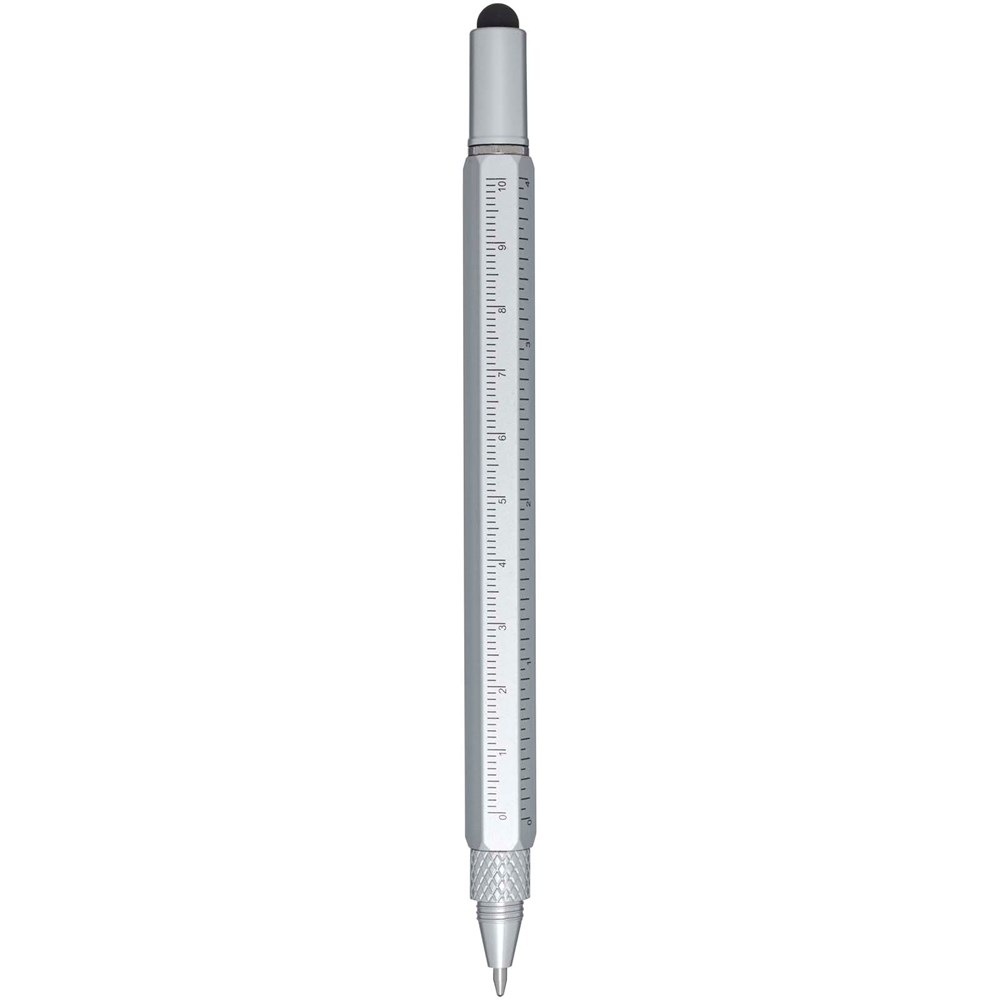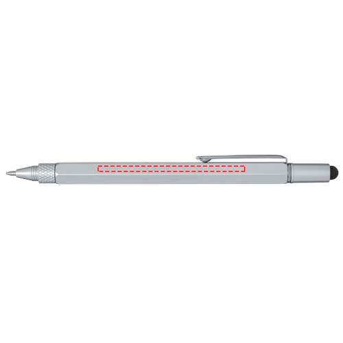 Der Dora Multifunktionskugelschreiber aus Aluminium besteht teilweise aus recyceltem Material und ist mit einem doppelseitigen Lineal, einer Wasserwaage, einem Schraubendreher, einem Neigungsmesser und einem schwarzen Stylus aus Gummi ausgestattet. Der Schaft besteht aus recyceltem Aluminium mit einer silbernen Sprühbeschichtung. Der Clip besteht aus Eisen. Der Schraubenzieher ist aus Stahl. Der obere Teil und die Spitze sind aus RABS gefertigt. Tintenfarbe: Schwarz. Schreiblänge: 400 Meter. Strichstärke: 1,0 mm.
