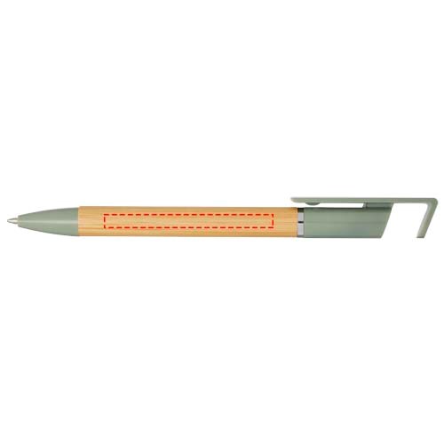 Bamboo-Kugelschreiber, der auch als Telefonhalterung fungiert. Der Knopf und der Mittelring bestehen aus recyceltem Kunststoff, die Spitze aus Messing und der Schaft aus nachhaltig angebautem Bambus. Tintenfarbe: Schwarz. Schreiblänge: 1000 Meter. Strichstärke: 1,0 mm.