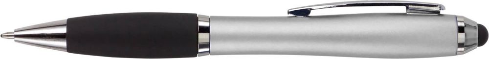Kugelschreiber aus Kunststoff, mit Drehfunktion, Metall-Clip, gummierter Griffzone, Touchpen und schwarzer Mine.
