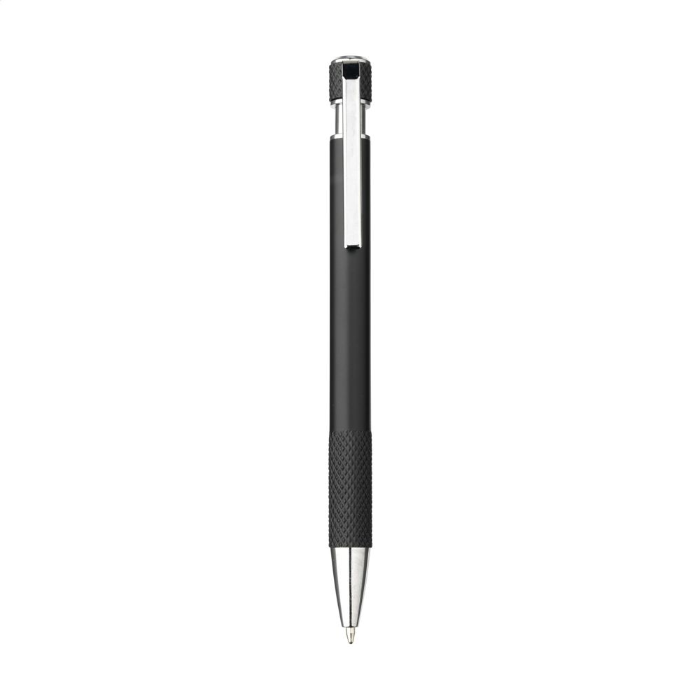 Kugelschreiber mit blauer Tinte und einem Gehäuse aus 100% recyceltem Aluminium. Mit rutschfestem Griff mit dezenten Prägungen, die sich stilvoll auf dem Druckknopf wiederholen. Mit silberfarbenen Hochglanzakzenten und Metallclip. RCS-zertifiziert. Durch die Verwendung von recyceltem Aluminium werden bei der Herstellung dieses Produkts weniger neue Rohstoffe verwendet. Das bedeutet weniger Energieverbrauch und weniger Wasserverbrauch.