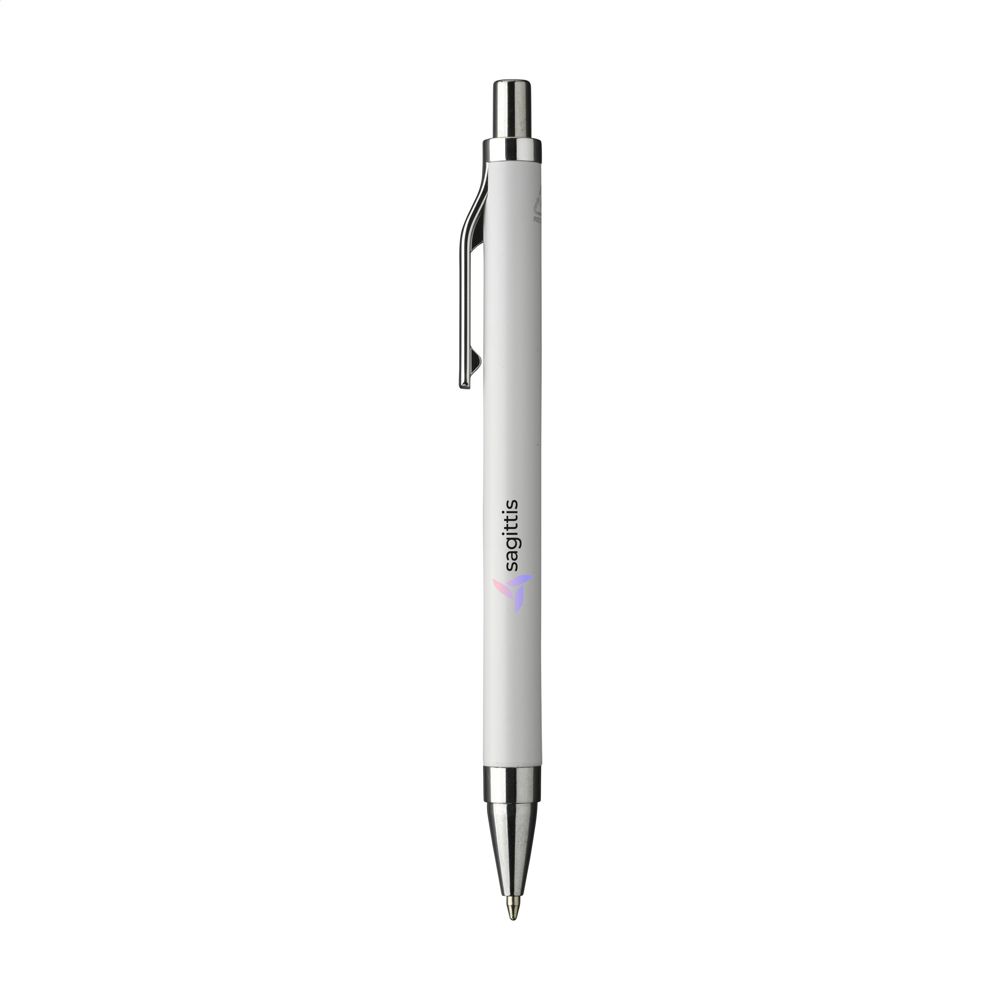 Modischer, blauschreibender Kugelschreiber mit einem Gehäuse aus 100% recyceltem Aluminium mit mattem Finish. Mit formschönem Metallclip und Gehäuse aus einem Stück. RCS-zertifiziert. Durch die Verwendung von recyceltem Aluminium werden bei der Herstellung dieses Produkts weniger neue Rohstoffe verwendet. Das bedeutet weniger Energieverbrauch und weniger Wasserverbrauch.