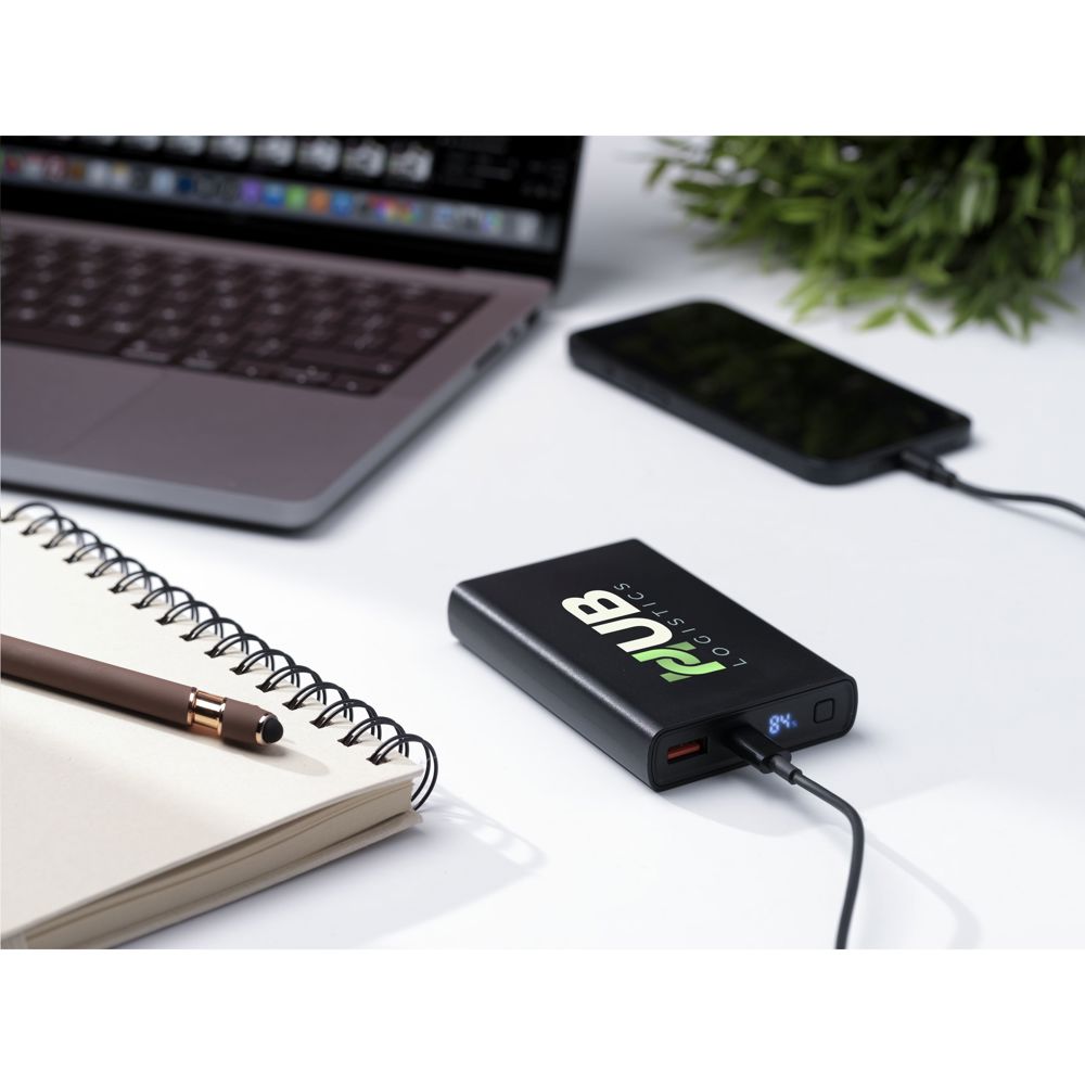 Leistungsstarke Powerbank mit integriertem 10.000-mAh-Lithium-Polymer-Akku. Das Gehäuse besteht zu 100% aus RCS-zertifiziertem recyceltem ABS. Mit Ein-/Aus-Taste und Display mit prozentualer Akkuanzeige. Typ-C-Eingang: DC5V/3A, 9V/2A, 12/1,5A. Typ-C-Ausgang: DC5V/3A, 9V/2,22A, 12/1,67A. USB-A-Ausgang: DC5V/3A, 9V/2A, 12/1,5A. Kabelgebundener Ausgang: 22W. Inklusive rTPE USB-C-zu-USB-C-Ladekabel und Gebrauchsanweisung. Verpackt pro Stück.