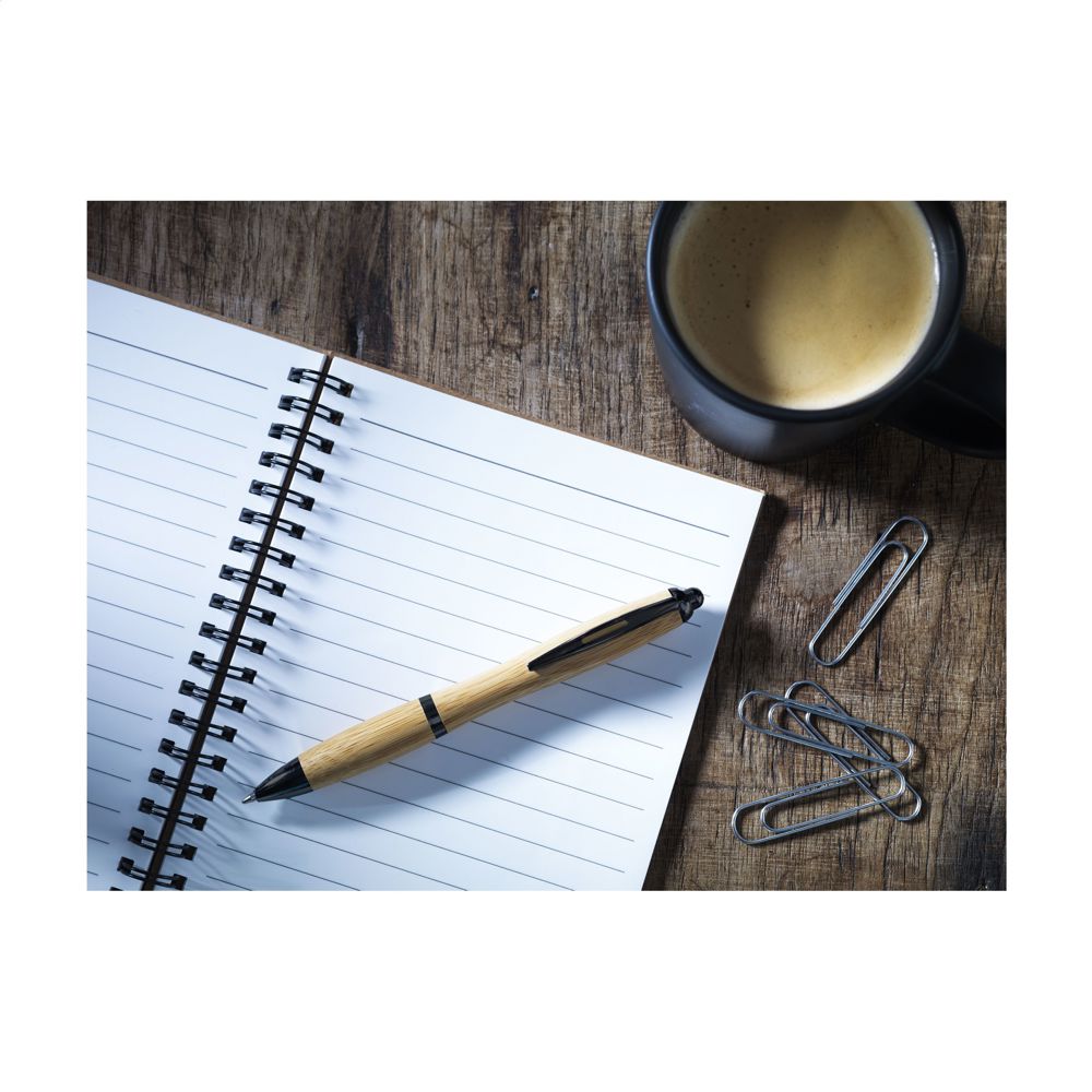 Blauschreibender Kugelschreiber aus Bambus mit Metallclip und silbernen Akzenten. mehr