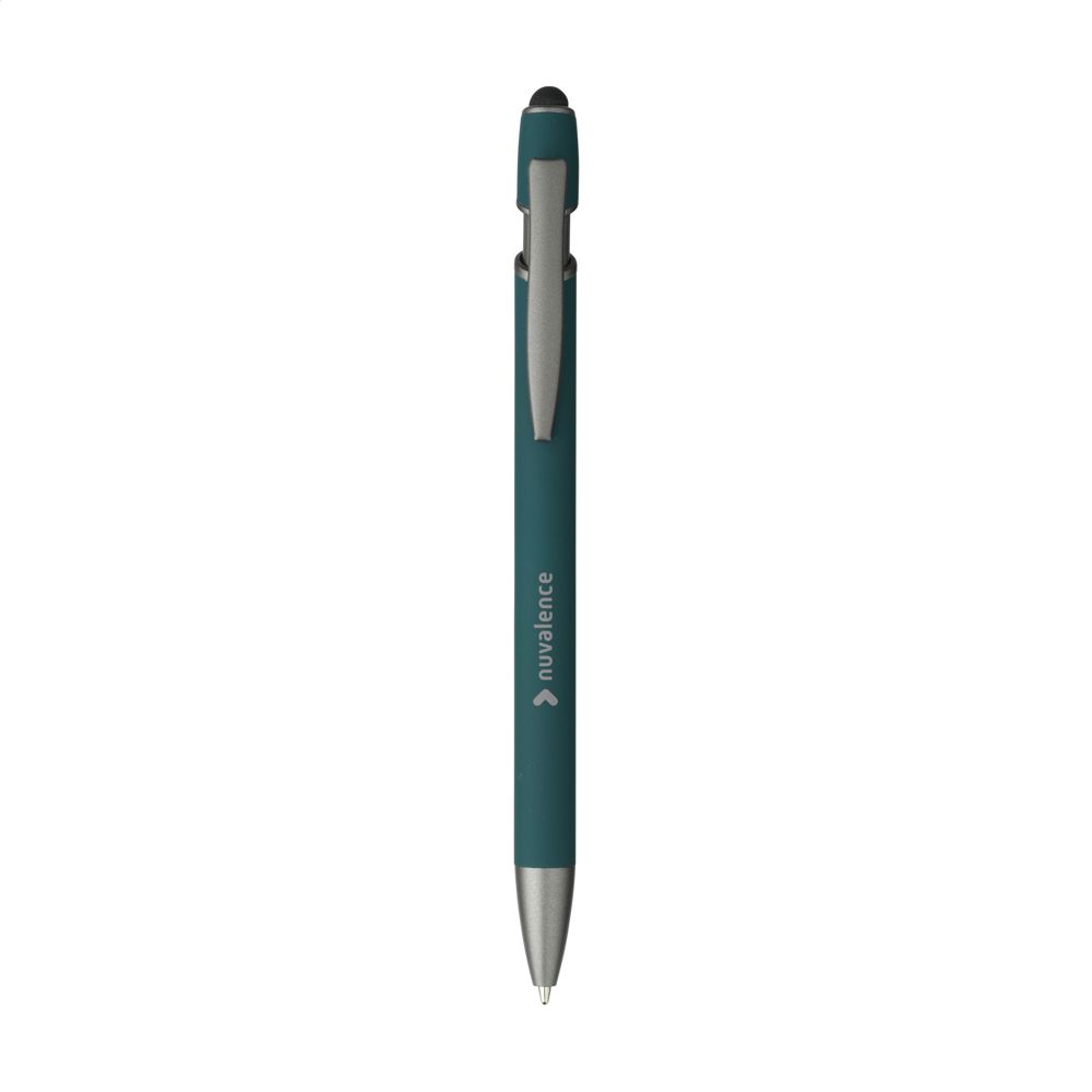 Blauschreibender Kugelschreiber mit einem Gehäuse aus recyceltem Aluminium. Das Gehäuse verfügt über eine gummierte Soft-Touch-Oberfläche und eine Gummispitze zum Bedienen von Touchscreens. Mit Metallclip. RCS-zertifiziert. Gesamtes recyceltes Material: 94%. Durch die Verwendung von recyceltem Aluminium werden bei der Herstellung dieses Produkts weniger neue Rohstoffe verwendet. Das bedeutet weniger Energieverbrauch und weniger Wasserverbrauch.