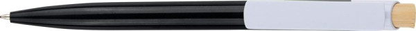 Recycelter ABS-Kugelschreiber mit Bambus-Druckknopf und weißem Clip. Mit recyceltem Logo im In-Mould-Verfahren. Ungefähre Schreiblänge 600 Meter. Blaue Tinte.