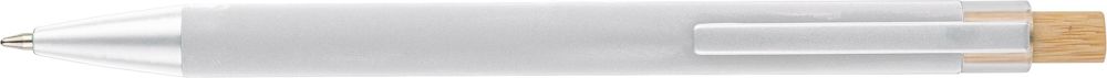 Dieser Kugelschreiber aus recyceltem Aluminium verfügt über einen Druckknopf aus Bambus und ein Detail aus AS-Kunststoff. Er verfügt über einen Metallclip und eine Kunststoffspitze in passenden Farben. Auf dem Schaft befindet sich ein lasergraviertes Recycling-Logo. Die ungefähre Schreiblänge beträgt 800 Meter. Blaue Tinte.