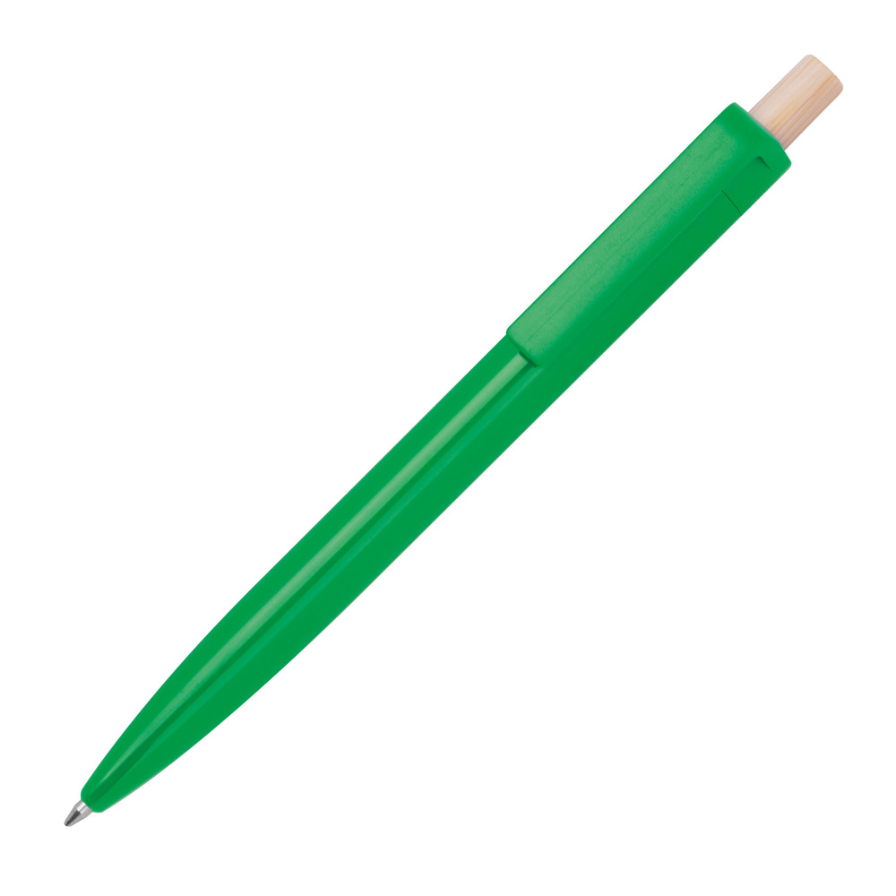 Kugelschreiber aus recyceltem ABS und einem Drücker aus Bambus. Er verfügt über eine blauschreibende Kunststoffmine. Ihre Werbung drucken wir unterhalb vom Clip aus den Schaft.