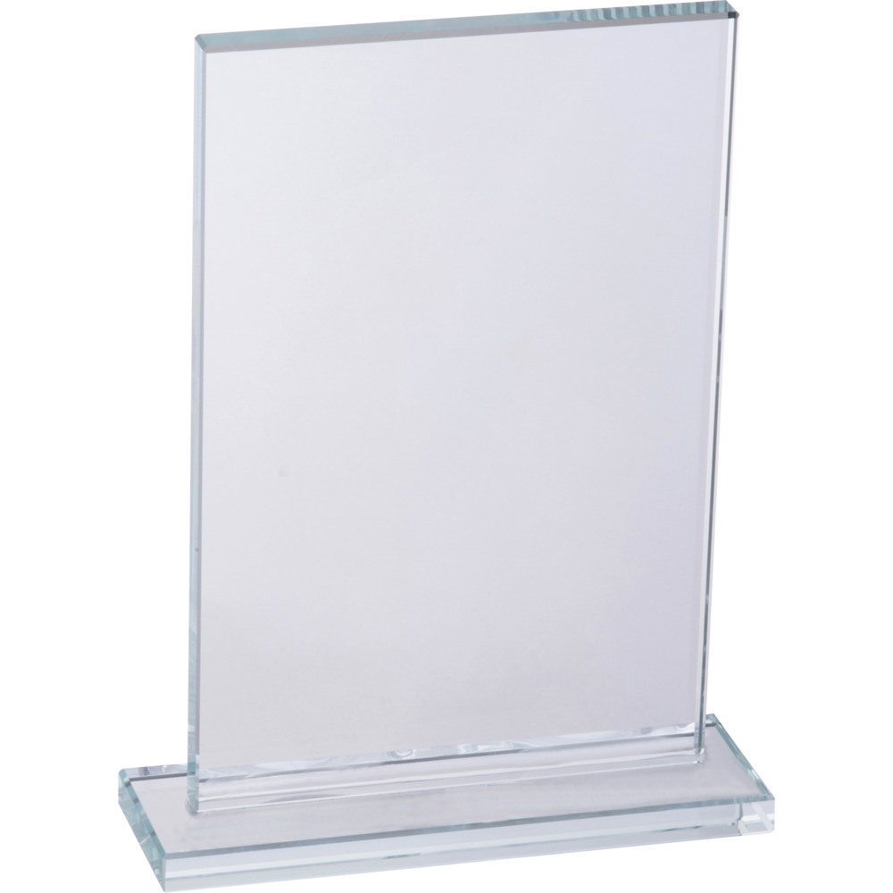 Trophäe aus Glas mit Standfuß. Verpackt ist die Trophäe in einer Geschenkbox mit Satineinlage und Magnetverschluss. Ihre Werbung bringen wir mittels einer Lasergravur auf der Trophäe an.